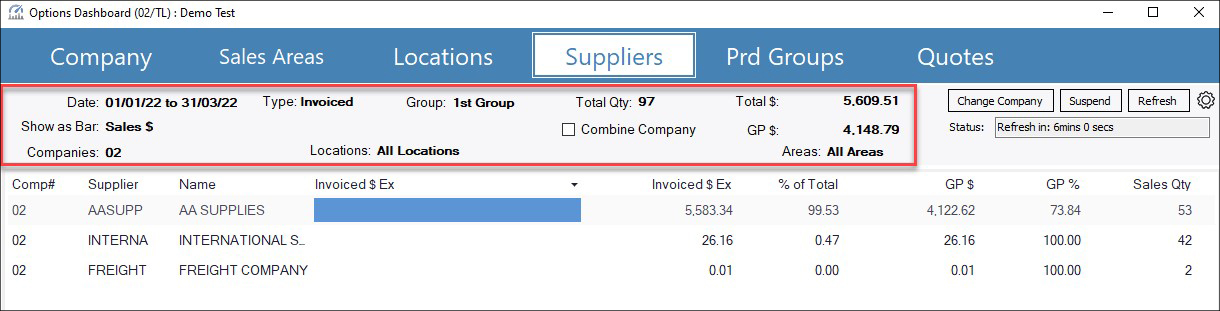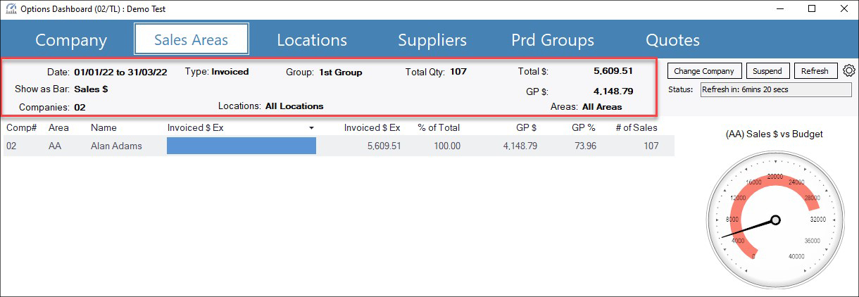 The Sales Dashboard offers a quick and customizable view of sales performance, segmented by key categories such as Company, Sales Area, Locations, Suppliers, or Product Groups.