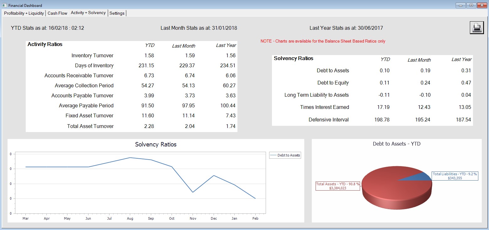 Activity + Solvency TAB: displays for YTD, Last Month, Last Year the Activity Ratios and Solvency Ratios.