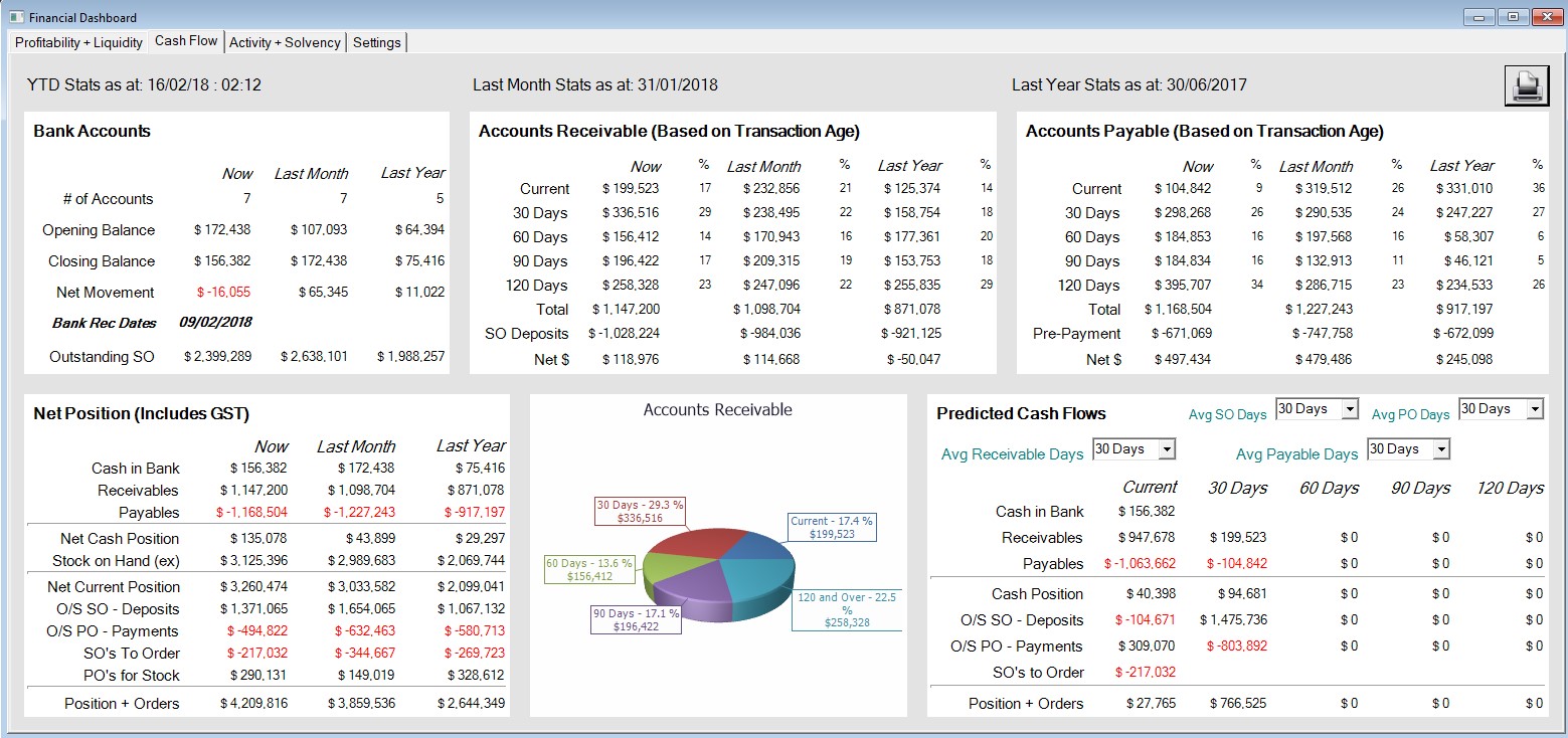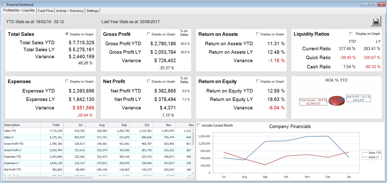 The Financial Dashboard is aimed at giving business owners quick summary information about their business and a number of KPI’s. It has been designed to provide quick financial analysis as follows: